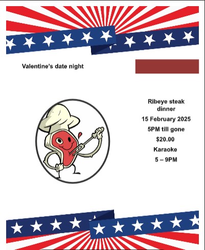 We are going to be extending the Valentine’s Day festivities into Saturday, February 15th. Bring your sweetheart or treat yourself to an amazing steak dinner expertly prepared by Bob Keener and Karaoke lead by Devin Claire from 5 – 9 pm.
